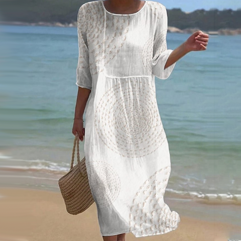 ELEGANCJA INSPIROWANA WYBRZEŻEM: Sukienka oddaje swobodny urok życia nad morzem dzięki luźnemu, zwiewnemu krojowi i subtelnym okrągłym wzorom. Oddychająca tkanina z domieszką bawełny zapewnia wygodę przez cały dzień, niezależnie od tego, czy spacerujesz nad morzem, czy spędzasz wieczór w mieście.